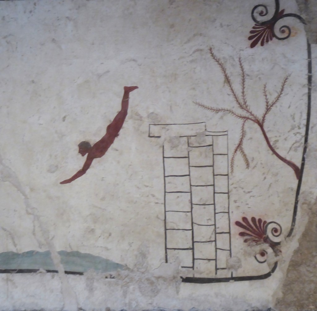The Museum over the road was excellent and well laid out with Greek and Roman artefacts found on site including rare Greek tomb paintings from around the 5th century BC [see the diver below].