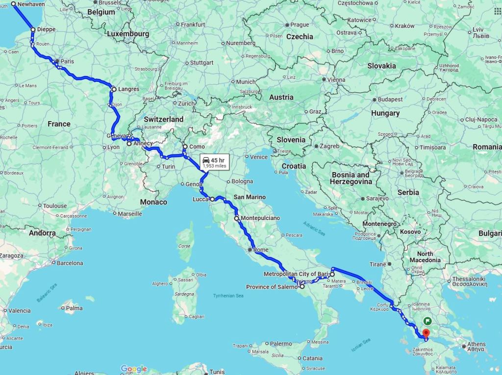 This page documents the journey by car with Leashia my wifey, from Newhaven in England, through France and Italy to Patras in the Peloponnese, Greece.