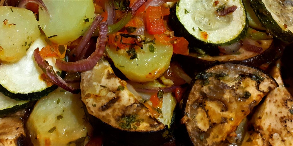 Ingredients: To serve 4 peeps as a main and more as a side – One sliced courgette, one smallish sliced aubergine, a medium red onion sliced, a couple of cloves of garlic finely chopped, a few skinned and chopped ripe tomatoes, a couple of skinned and sliced waxy potatoes, a huge glug of Greek olive oil, finely chopped fresh parsley, salt and pepper, Optional: One sliced green pepper.