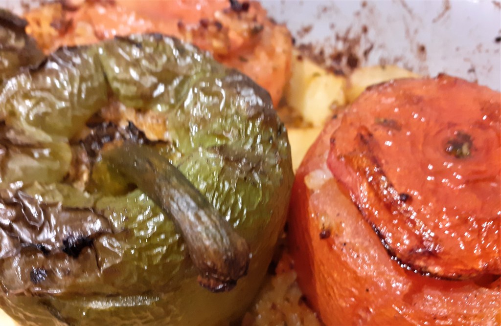 Ingredients: To stuff two peppers and two beefsteak tomatoes which should feed 2 peeps- 2 beefsteak tomatoes, 2 bell peppers, 120gms of risotto rice, one medium onion, half a courgette, half a carrot. 1 large garlic clove, 100ml of veg stock, a dash of white wine [not very authentic], a handful of finely chopped fresh herbs – parsley, mint, dill, a pinch of rigani, loads of pepper and salt, a large amount of Greek olive oil [don’t be frugal], 100ml water, a few red potatoes, optional – half a lemon.