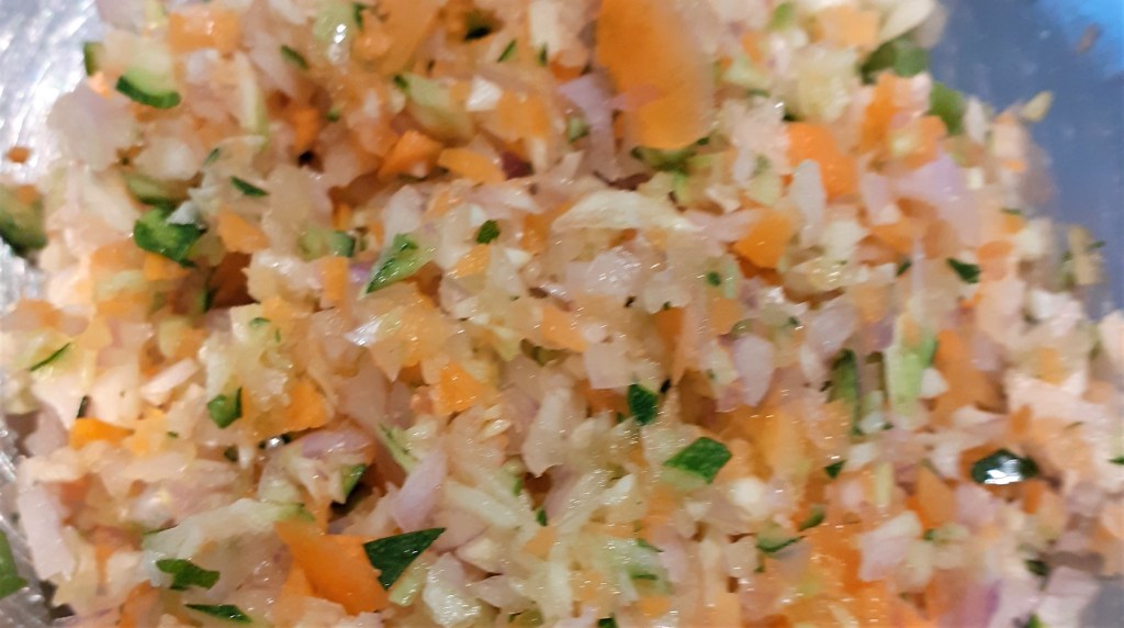 Method: Turn the tomatoes upside down so they are sitting on their stalk end and slice off the tops and carefully spoon out their insides. Whizz the pulp for 2 seconds in a blender and then pop the mush into a bowl. Place the hollowed out tomatoes in a baking dish. Slice off the tops of the peppers and scoop out their insides too and place the hollowed out shell next to the tomatoes in the baking dish. Save any edible scooped out pepper in a seperate bowl. If the peppers are a bit wobbly very carefully slice a little bit off their bottoms so they stop wobbling. You need the courgette, carrot, onion and garlic to be finely chopped – you can do that by hand or do what I do which is place it in the blender with the pepper bits you have reserved and pulse the mixture for about 5 seconds. Don’t overdo it, you don’t want it reduced to a pulp.