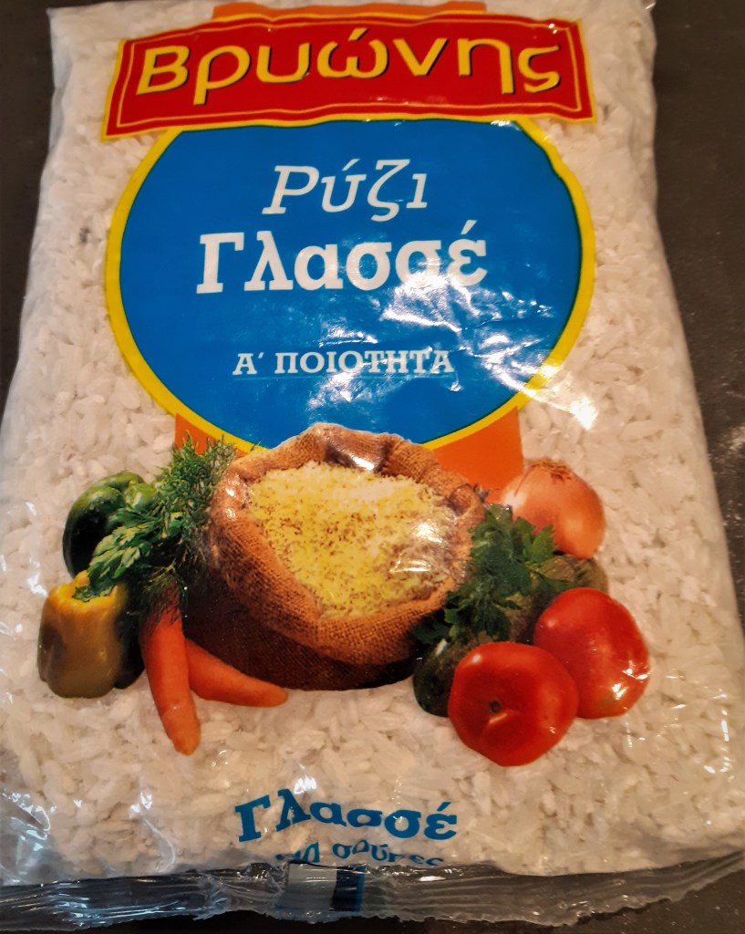 For this recipe you need a medium grain glutinous rice. In Greece it’s called Glacé rice [see picture]. In England you will probably have to use Italian risotto rice. [Thank you Nikki for helping me here]