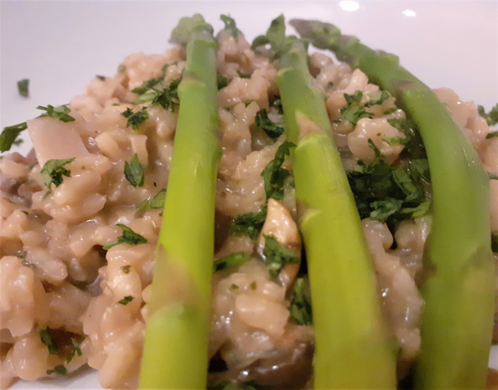 Method: Start by soaking the dried mushrooms in some freshly boiled water and leave for 20 minutes. Make up the stock and keep it warm on the hob in a suacepan. Add the porcini liquid to this stock through a sieve [to get rid of any bits]. Then in a heavy based saucepan gently cook the onions and garlic for a few minutes in some olive oil and the butter. I use red onion as it looks attractive in the risotto. Throw in the rice and stir to make sure it’s glistening with the oil and butter then pour in a glass of white wine and let it bubble before stirring in the porcini mushrooms. [The other glass of wine is for you while you cook the risotto!]. Ladle the warm stock into the rice one spoon at a time. Stir after each addition and simmer for about 20 minutes until the rice has softened and all of the stock has been absorbed, [you can add more stock or water if required]. In a third saucepan quickly fry the mushrooms in some oil and then gently stir this into the rice, then add the parmesan and some of the chopped parsley and plenty of ground pepper. Finally stir in the gorgonzola cheese and serve sprinkled with some chopped parsley, adjust the seasoning if needed. As you can see by the photo I like to add a few asparagus spears, a green salad works well on the side too.