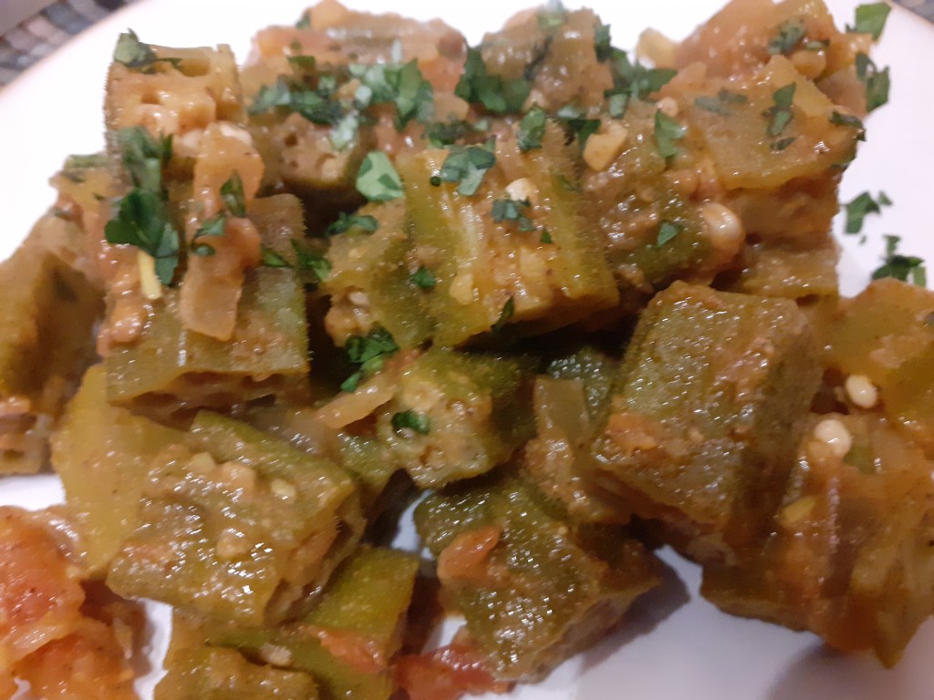 Ingredients: To serve 4 peeps as a side dish [or 2 – 3 as a main] – 500 g of okra, 1 small onion roughly chopped, 3 or 4 ripe tomatoes skinned and chopped, one clove of finely chopped garlic, half a teaspoon of ground cumin, half a teaspoon of ground coriander, half a teaspoon of turmeric, small stick of cinnamon, a sprinkle of chilli powder, salt and pepper, veg oil.